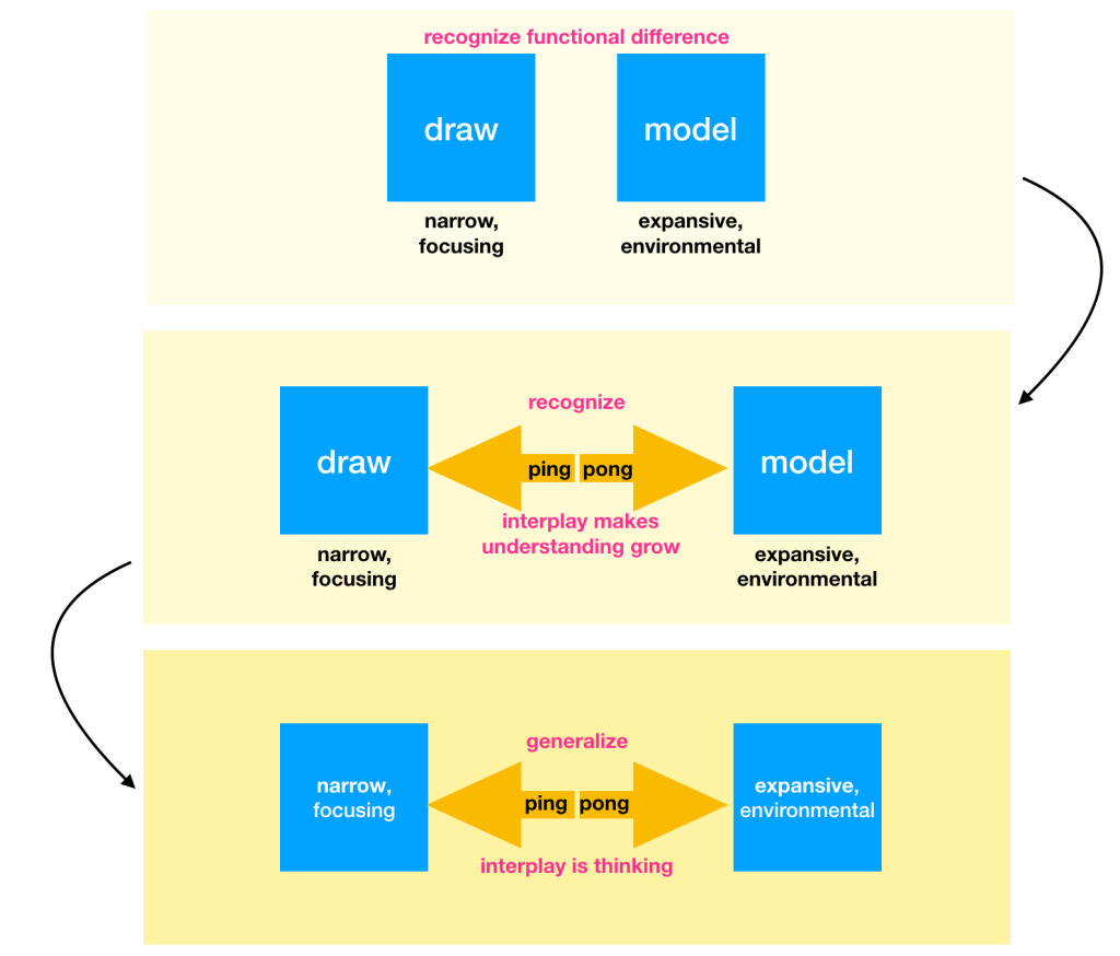 With this fact, of the back and forth (environment and acts of focus in tandem), the idea of replacing drawing with modeling is well and truly, and fundamentally, undermined, and permanently so. Drawing is not going away. It’s fundamental, and our understanding of models requires it. This will remain true long after everyone who is working today retires, and will remain true, always.