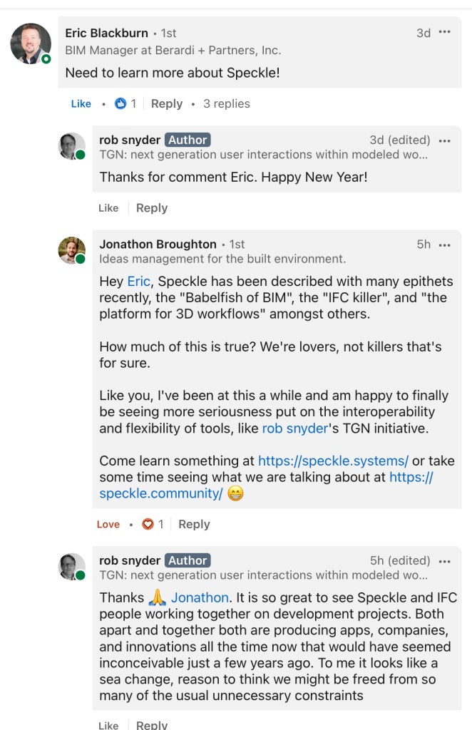 By the way, as an example, USD includes concepts of rigging. As of course is essential in the film industry. It’s essential in AEC too, though the realization of this is suppressed by digital tech itself, so far. See: https://remedy-entertainment.github.io/USDBook/what_is_usd_not.html