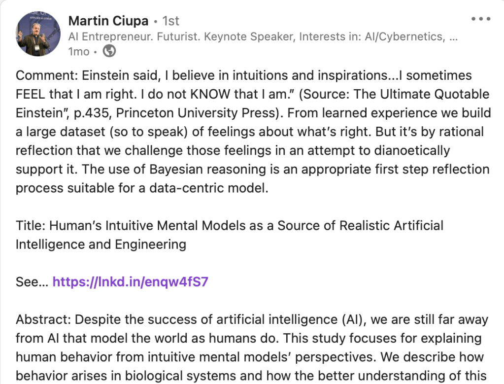 Here’s a collection of discussions about AI that came my way on LinkedIn. I followed Martin Ciupa. Lucky me. He’s thoughtful, prolific, and clear. So most of these are his posts. They all grapple with how you develop a machine, an artificial intelligence, to engage with an environment in ways such that the engagement leads to:
