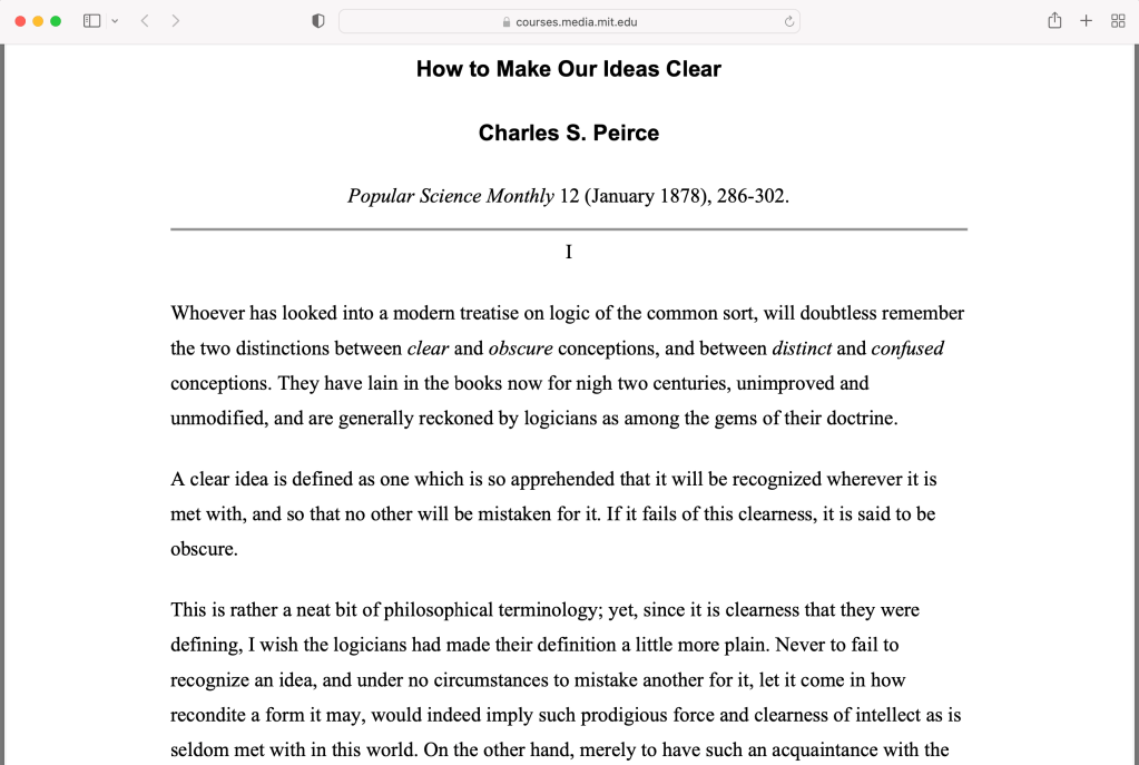 https://courses.media.mit.edu/2004spring/mas966/Peirce%201878%20Make%20Ideas%20Clear.pdf