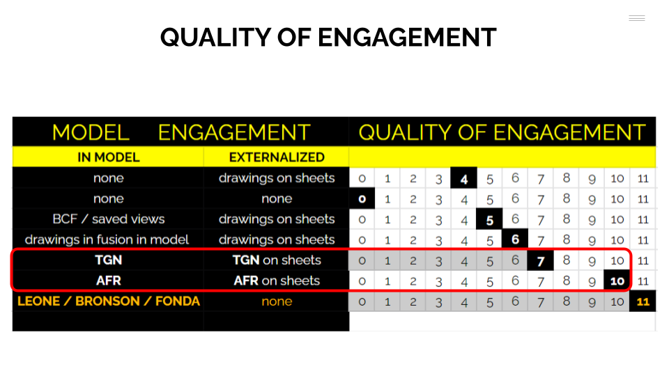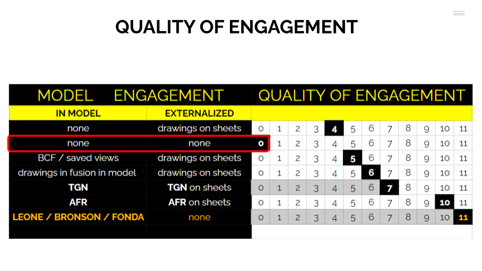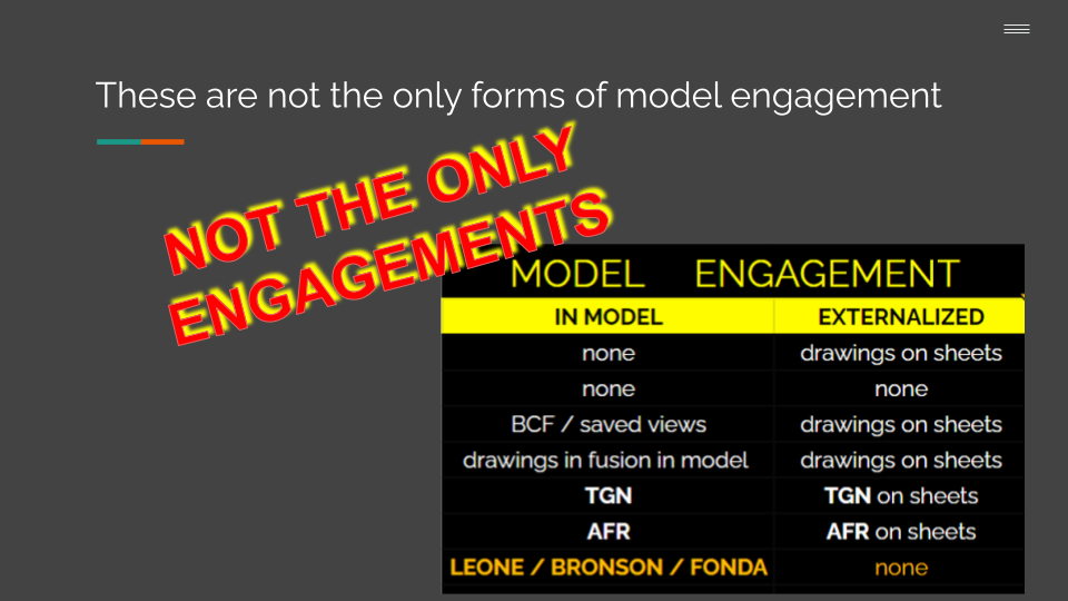 I mean, this is completely obvious, right? just get in a car and drive around your AEC model and run over stuff?… Is that a useful form of engagement in technical models? Or, as some people advocate, how about no form of engagement at all?  Well, if running around with a gun or a car in technical models is ineffective, I’ll just add that no engagement at all is even less useful. Something more is needed.