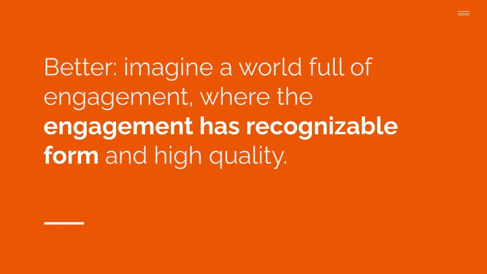 That is, recognizable in its traditional form. Its digital form remains underdeveloped. TGN is a specific proposal for engagement’s further development.