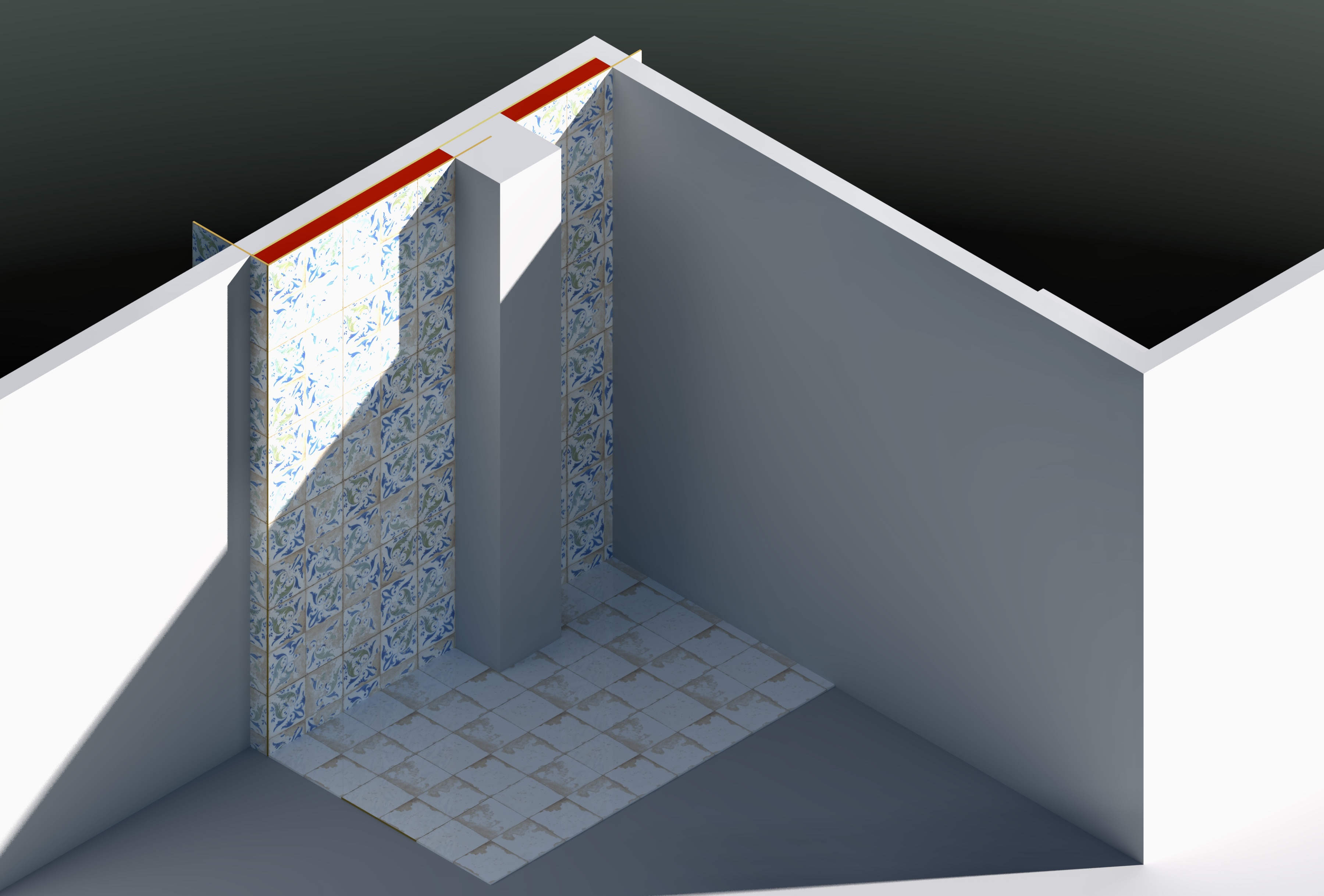 It’s correctly dimensioned with the tile joint spacing included. I was concerned with the tile grid lines so I modeled them two different ways, first with a whole tile against the wall corner and building out from there, then aligning the tile grid at the left edge of the chimney.