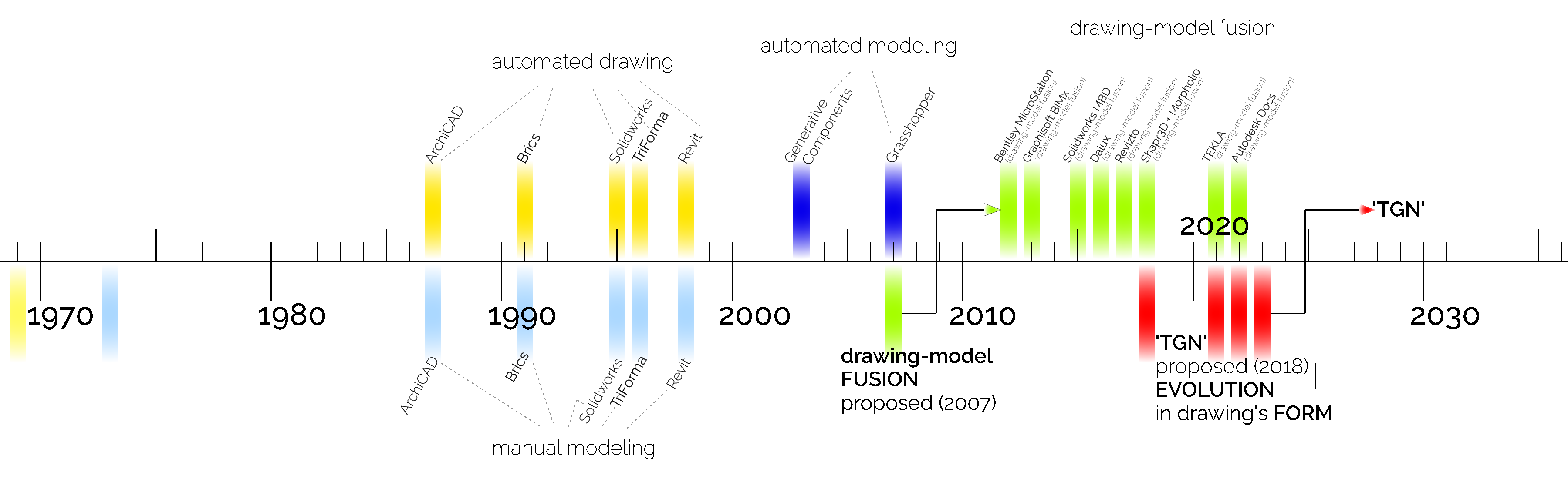 I led the team that first developed and commercialized the automated fusion of technical drawings in-situ where they actually are within digital models (the first green bar above the timeline, in Bentley MicroStation).