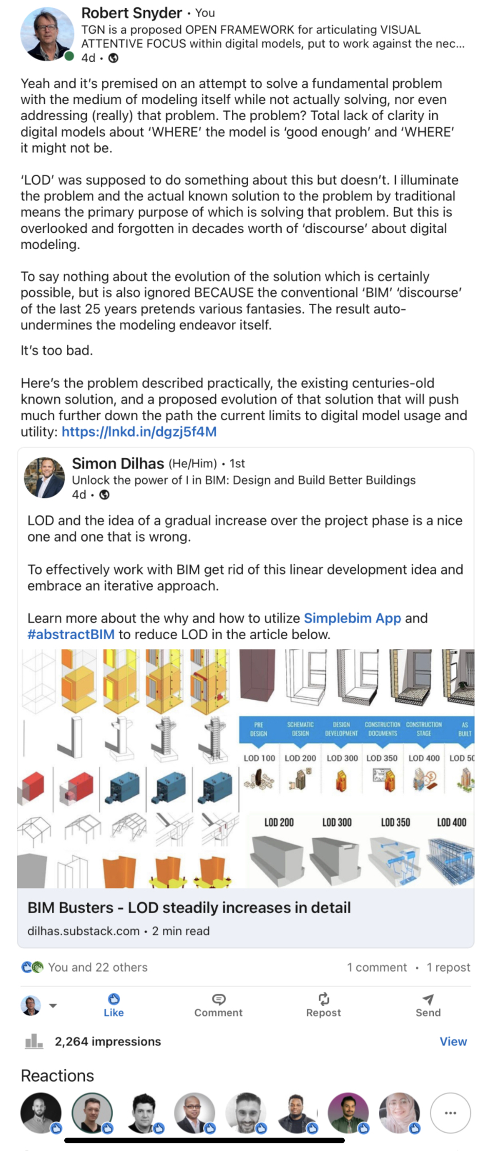 ‘LOD’ was supposed to do something about this but doesn’t. I illuminate the problem and the actual known solution to the problem by traditional means the primary purpose of which is solving that problem. But this is overlooked and forgotten in decades worth of ‘discourse’ about digital modeling.
