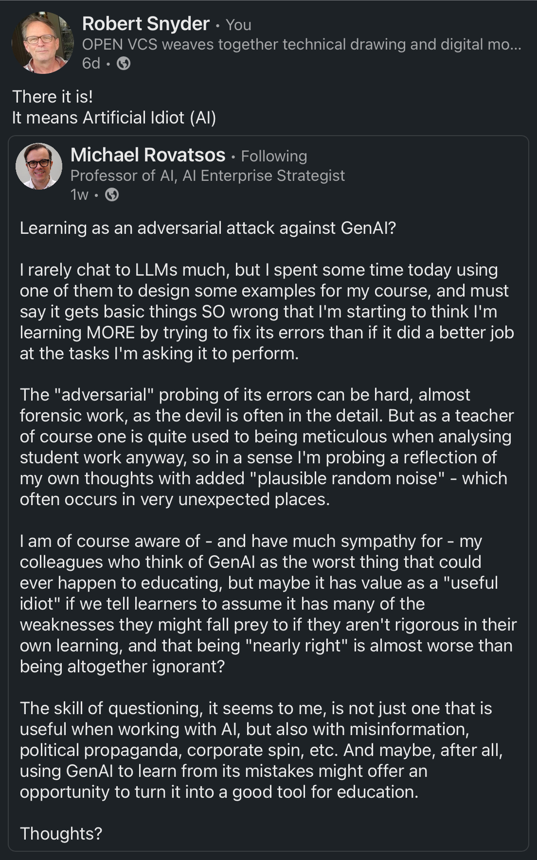 The word abbreviated in “AI” undermines itself. Right? It auto-undermines the endeavor it promotes: AI.