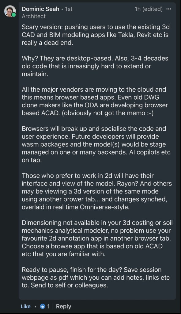This thing we call drawing can evolve though. It can be authored in a different way, in the models, and the way we engage with it visually can be very much elevated. That’s what OPEN VCS intends to do, in every modeler, or starting with a standalone browser tab or app that does it in a speckled or other pipelined expression of your models.