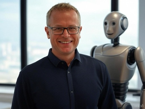 “Grok: Show Robert Snyder of OPEN VCS smiling with a humanoid robot servant.”