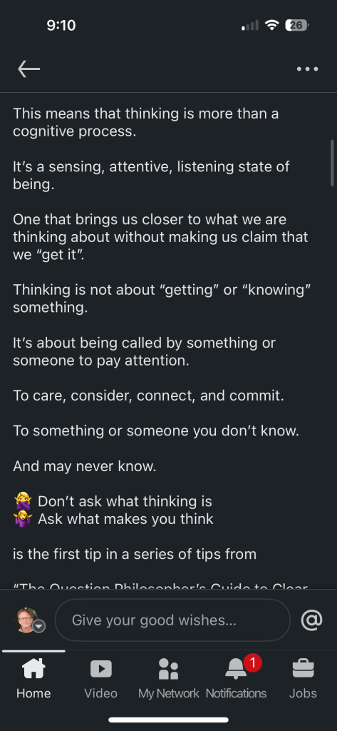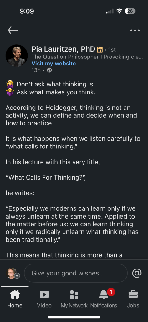 This makes you want to go back and read Heidegger again (thank you Pia Lauritzen, PhD), because none of us, including Heidegger himself, has yet begun to think, he says: