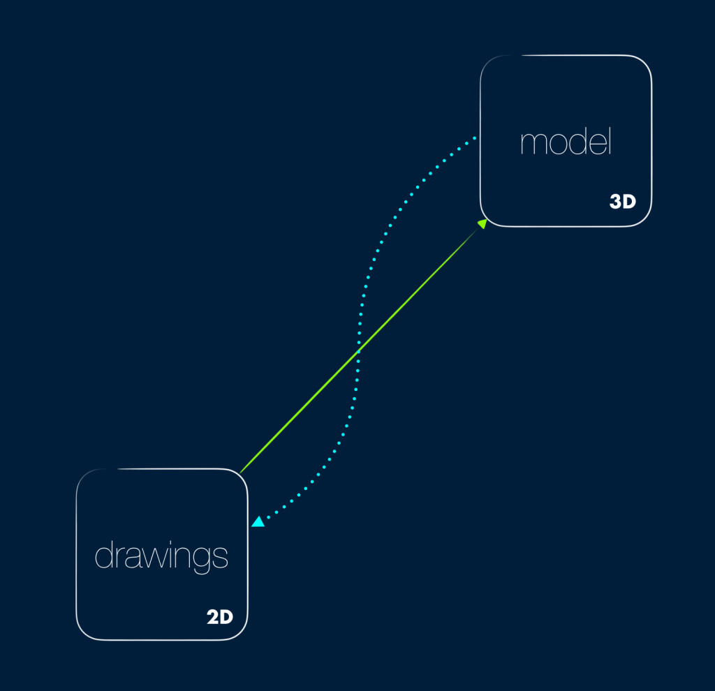 The green arrow is the conceptual progression from drawings to models. The idea is that models will replace drawings, eventually, and that in the meantime in a transitional period, drawings will be automated from models (the blue dashed arrow):